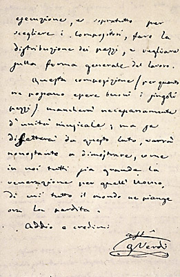 Bereits während sein langes leben und damit verbunden ein halbes Jahrhundert das Giuseppe Verdi mit seine Gatttin Giuseppina Verdi-Strepponi seine Villa mt selbst angelegter Park in Sant'Agata bewohnte und dort ach seine meisten Opern komponierte, gab es nie die minimalste Notiz die in einem Papierkorb verschwand. So gab es am Ende Verdis Leben 1901 ein aus mehrere Dutzend Tausend Handschriften bestehendes Achiv... d.H. die Copielettere - selbst gefertigte Kopien von unzählige versandte Briefe, nahezu alle erhalten Antworten auf versandte Briefe, die Tagebücher Verdis Ehefrau und um die 6000 Musikskizzen; die Entwurfe viele Opern .