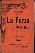 Lyrische Tragödie (Oper) in 4 Akte (8 Bilder) auf ein Libretto von Francesco Maria Piave nach dem Drama Don Alvaro "La fuerza del sini" (1835) von Angel de Saavedra y Ramírez de Baquedano Duque de Rivas, unter Einbezug des ersten Teils, Wallensteins Lager (1798), aus Friedrich Schillers dramatischem Gedicht Wallenstein, in der italienischen Übersetzung von Andrea Maffei - Uraufführung: 10. November 1862 - Bolschoi Theater (St. Petersburg)